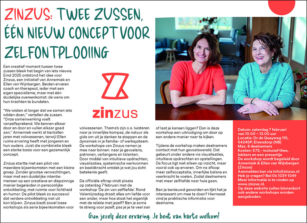 De Zin van Zelfliefde In het Gemerts Nieuwsblad van 20 januari 2026 de aankondiging van Zinzus en de eerste workshop “De Zin van Zelfliefde” die op 7 februari 2026 gehouden werd.